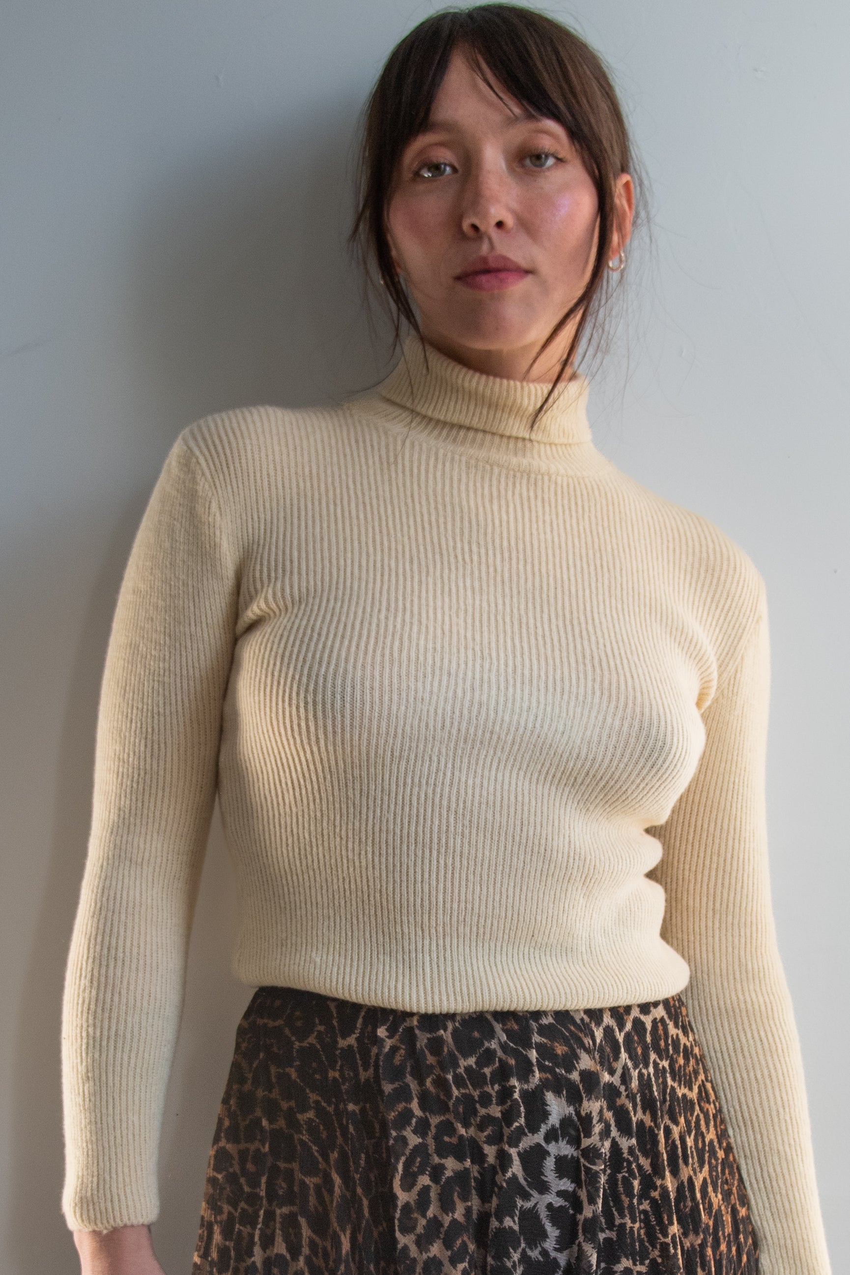 Simple rib stitch knit wool cream sweater with zip back mock neck.