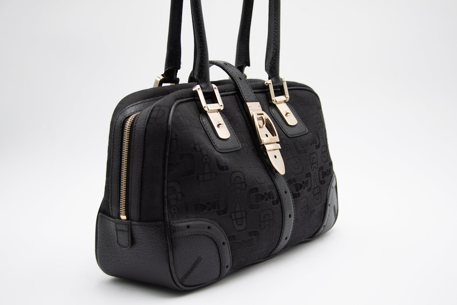 Gucci Purse collection of 1990’s Tom Ford black purse. This duffle style has a buckle monogram print and gold hardware accents.